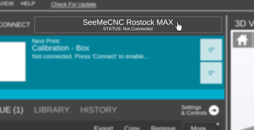 | To start the 3D printer connection wizard if you already have printers configured in MatterControl, click the box with the name of the currently-selected printer at the top of the screen. |
